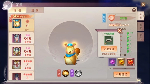 宠物副本解锁后,点击界面右侧的“日常”按钮,在日常活动里找到“宠物进阶”,点击就能进入宠物副本。目前宠物副本仅有一关,副本难度较低,对战力要求也不高,进入后设置自动挂机,就能完成任务领取奖励。