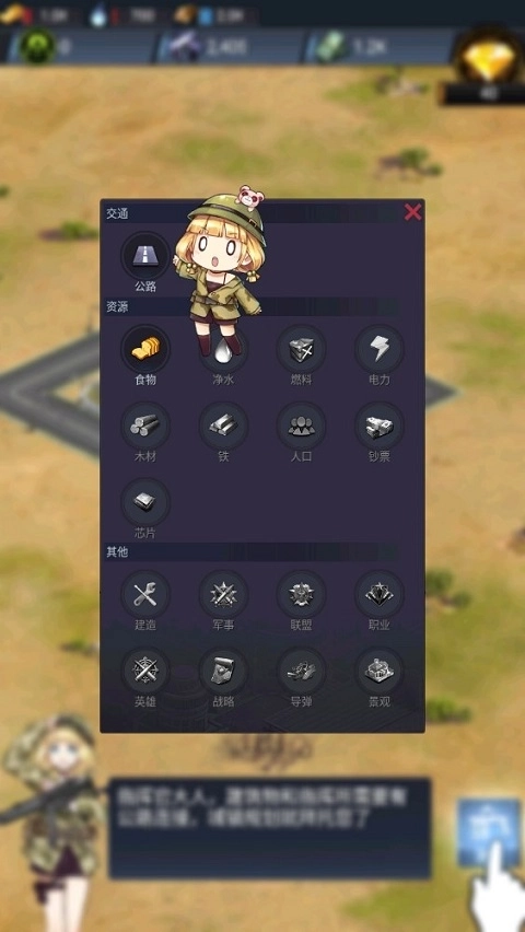 2、点击左侧的“建造”功能,在此处能看到众多可供建造的设施。其中,交通类设施包含公路;资源类涵盖食物、净水、燃料、电力、木材、铁、人口以及芯片等。