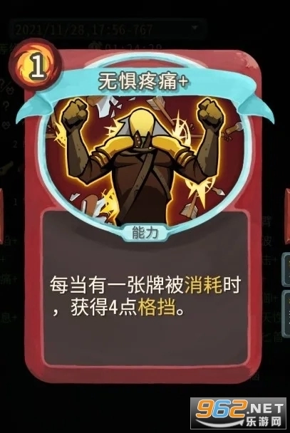 无惧疼痛+:每当有一张牌被消耗时,获得4点格挡。