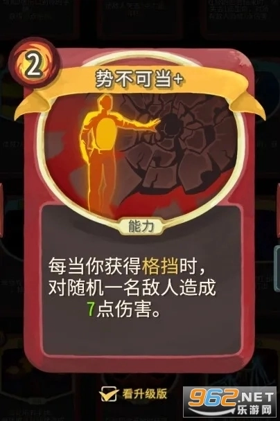 势不可挡+:每当你获得格挡时,对随机一名敌人造成7点伤害。