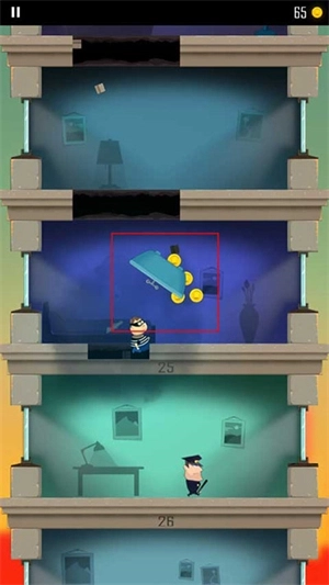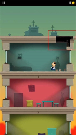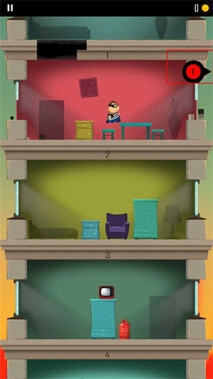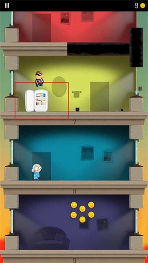 一位戴着黑眼罩圆脸胖嘟嘟的中年男人,穿着黑白条纹短袖上衣深蓝色西裤,双手高举站立在画面中央,简单直接地把一个活生生中年男人当小偷的形象表现出来了。 游戏里楼层的设计颇为简洁,每个房间摆放着冰箱、沙发、电视这类基础家具。值得称赞的是,每一层的色彩调配得精准到位,给人一种极为舒适自然的视觉感受。在角色设计方面同样独具匠心,无论是一脸严肃、不近人情的警察,还是生气时会踢你一脚的老奶奶,都能让人感受到一抹诙谐的氛围。 2、玩法与操作