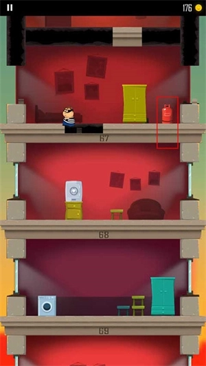 尽管这是一款年代久远的游戏,却丝毫不影响我们对它的喜爱。仅看游戏截图,或许会让人产生类似《是男人就下100层》的直观感受。在那个游戏发展尚未如今这般成熟的年代,一款由Flash制作的小游戏所带来的体验,丝毫不逊色于当下的高科技游戏。若仔细剖析这些小游戏,便会发现它们存在共同特征,那就是通常上手容易、通关不难,但想要做到完美却颇具难度。 设备上手轻松,传播便捷,而且每关目标达成毫无难度,即刻就能收获乐趣,还能通过数据对比滋生成就感,不断促使玩家反复体验游戏。可真深入游玩后,才发觉并非如此简单,要做到完美堪称困难重重。但恰恰在这时,人们内心的征服欲被激发出来,越是看似简单的事,就越渴望做到尽善尽美,心里总会想着这么容易肯定能实现。所以,不得不佩服那些能拿到上千分的大神,毕竟将简单之事做到极致,也不失为一种独特的乐趣啊! 1、游戏开始会有一个小偷开始跑到另一层楼,玩家需要做的就是通过角色屁股着地的方式破开楼层,这样就能不断到达底下那一层了; 2、当角色不断跳跃的过程中,左右两边会出现这种红色感叹号,这表示导弹即将发射过来,你需要做的就是做好准备进行躲避; 3、玩家在跑酷的同时,还需要收集金币,金币可以用来购买道具和生命值,这样就能更快地通过楼层了; 4、角色到达每一个楼层时,里面的东西都会不一样,有些是板凳、冰箱、煤气罐等,下面我为大家来介绍这些东西的作用,冰箱是类似护盾的功能,用来抵挡一次导弹、警察的攻击; 5、有时候会遇到老奶奶、老爷爷、警察等角色,这些人负责驱赶玩家或者攻击玩家,玩家可以躲避或者用道具将这些人打倒即可; 6、下面开始介绍浴缸的作用,浴缸的作用就是帮你破坏好几层的楼房,这样就能加快跑酷的速度了; 7、有一层玩家会进入到水池里,这里面的小鱼里面会有金币,玩家将小鱼全部吃完之后就可以从底下的管道出去; 8、而煤气罐的作用就是当玩家被导弹攻击变小时;就能靠煤气罐再次变大,这样更方便破坏楼层吃金币; 一、火箭