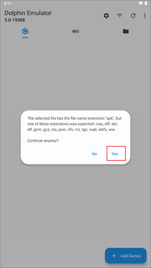 1若想把手机上的游戏导入,第一步是点击右上角三点中的“Open File” ,或者点击右下角的“Add Games” 。