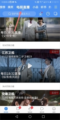 1、用户打开百搜视频app,进入页面后,把页面顶部的内容导航条滑动到【电视直播】位置(即下图红色箭头所指区域),就能进入电视直播页面。