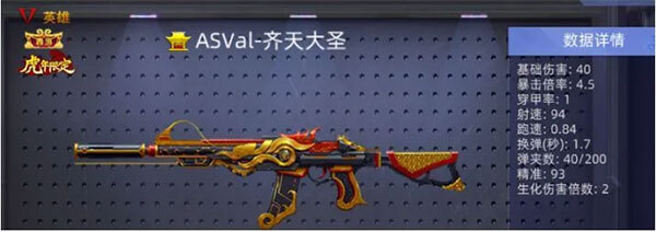 ASval-齐天大圣: 苦练七十二变,笑对八十一难。西游齐天大圣降临边境时间与asval步枪融为一体拥有技能:金箍棒(可以在步枪和金箍棒之间切换,金箍棒普攻可以同时攻击两个敌方,金箍棒切换步枪加持buff);大圣归来(3s步枪攻击不消耗子弹)