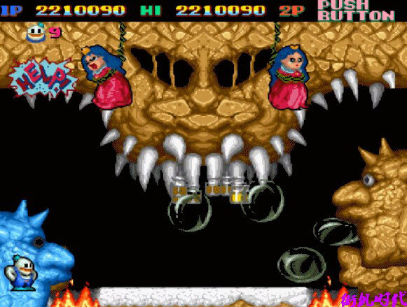3、《雪人兄弟》存在一个颇为有趣的设定,玩家只要坚持一阵子,就能直接通关,打不打死 BOSS 都没关系。笔者试过在不清理敌兵的情形下,径直跳到 BOSS 背后发动普通攻击。结果一直拖到过关,BOSS 都没被打死,这意味着 BOSS 极有可能无法用子弹击毙。可事实真的如此吗?