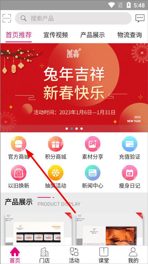 1. 开启养森,登录后进入首页,首页呈现推荐产品展示、宣传视频、物流查询、商城、积分商城、素材以及新闻中心等板块,接着点击商城。
