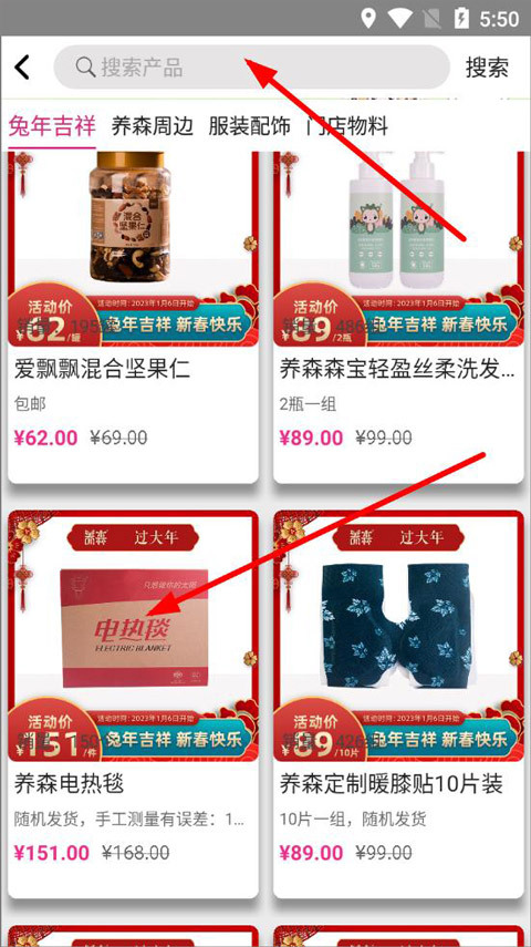 2. 进入购物页面,该页面设有新年新品、养森周边、服装配饰、门店物料等分类。用户既能够在搜索框内搜索所需产品,也可以通过下拉操作选择相应产品。