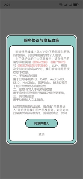 1.打开App,阅读用户隐私协议之后点击同意并进入