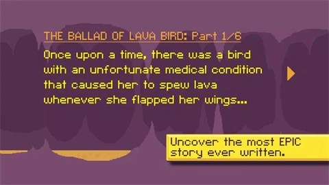 4、在游戏里,当玩家成功击败小鸟时,便会触发一段故事。很久很久以前,存在着一只鸟,它的身体状态欠佳,每次扇动翅膀都会喷射出熔岩。
