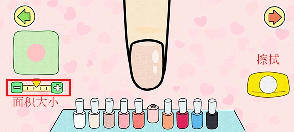 -每一个指甲都能够对颜色分布进行自定义设置。在左侧,能够调整指甲油点触的大小;而右侧则可用来将多余的颜色抹除。