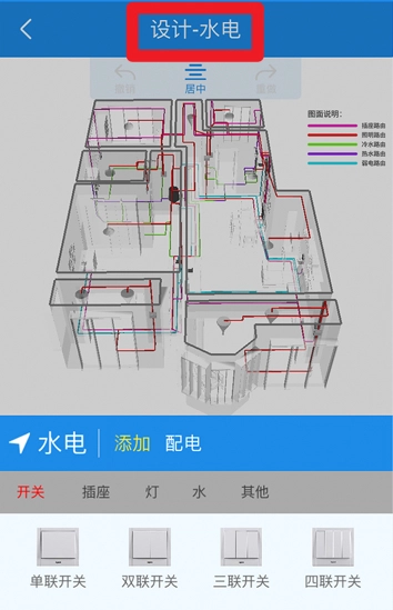 4、在【设计 - 水电】功能里,能直观查看房屋水电布线情况,还可添加并配置开关、插座、灯具、水路等。