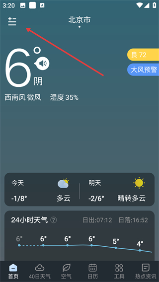 1、在天气应用首页点击左上角的菜单按钮,进入城市列表管理界面。