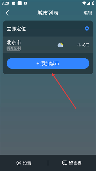 2、在城市列表页面点击【+添加城市】按钮,进入城市选择与搜索界面。