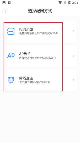 3、在选择配网方式页面,可根据设备类型选【扫码添加】-【AP热点】-【网线直连】中的一种方式完成配网。