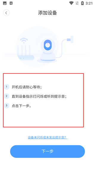 4、添加设备时,需等待设备指示灯闪烁或发出提示音,确认后点击【下一步】,继续完成设备的配网绑定。