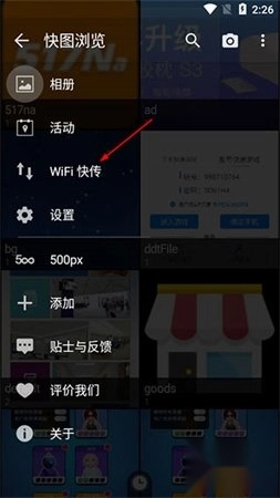 1、首先打开快图浏览软件,在界面左侧找到并点击“Wifi快传”选项。