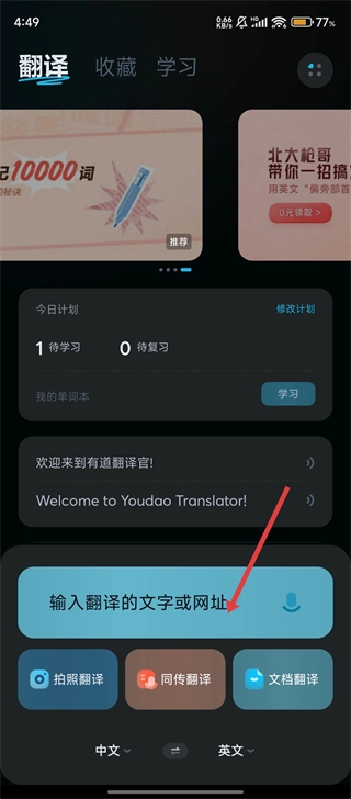 1启动有道翻译官应用后,找到标有“输入翻译的文字或网址”提示的输入区域并点击,就能着手输入需要进行翻译处理的内容了。