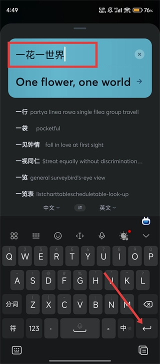 2、在输入框中输入【一花一世界】,系统会自动生成英文翻译,点击确认即可查看完整翻译结果哦。