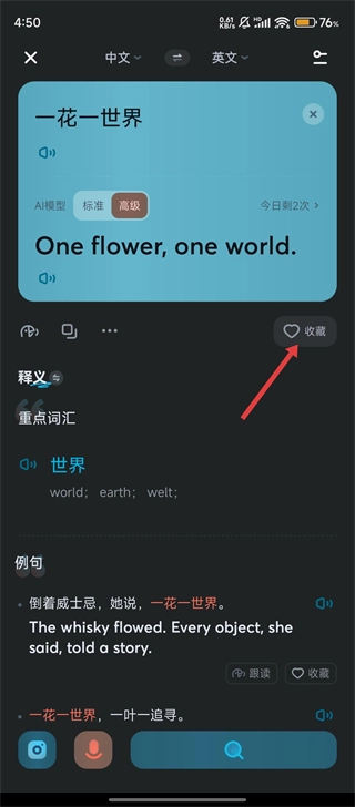 3、翻译完成后,点击【收藏】,可将该翻译内容保存,方便后续复习使用呢。