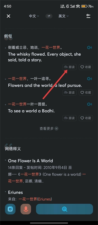 4、在例句区域,点击【跟读】,可以跟着练习发音,提升英语听说能力呀。