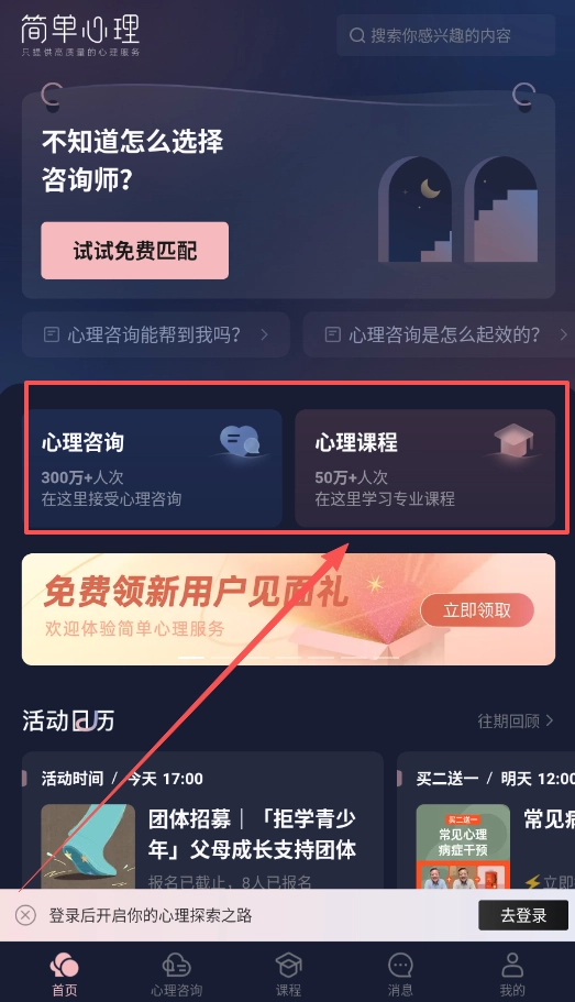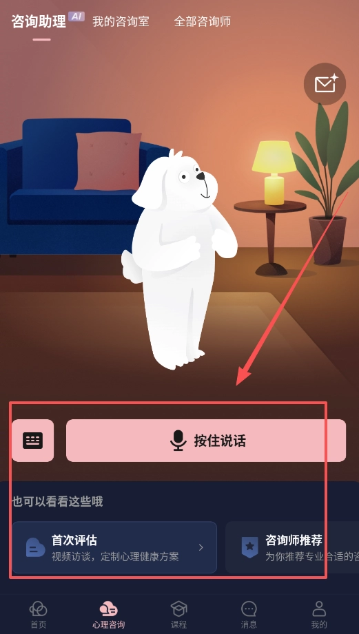 1进入应用后,底部的导航区域包含了五个功能分区,分别对应着主页、心理辅导服务、学习课程、消息通知以及个人中心,建议先花些时间逐步了解各个区域的位置和功能,熟悉整体的界面结构。