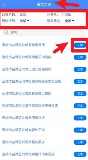 3、在餐饮监管详情页中,可筛选监管机构、监管员与状态,查看每家餐饮单位当前经营状态是否为正常。