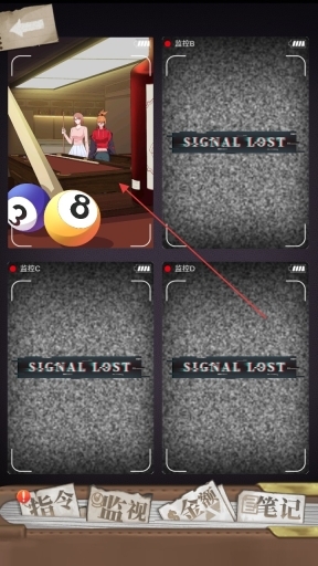 2、监控界面有四个监控,其中监控A显示有台球桌、人物等,其他监控显示暂时未开启,点击关注监控A的内容。