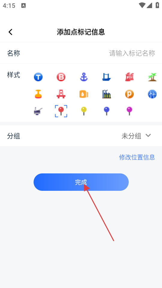 4在点标记信息的新增页面,填写标记名称、选定样式与分组类别后,点击【完成】按钮,即可顺利完成点标记的创建操作。