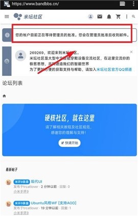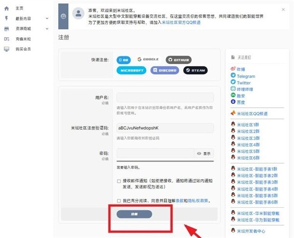 跳转至米坛社区,点击右上角注册