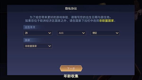 4、登录账号或游客进入游戏后,我们需要首先对国家以及年龄进行填写。注意:年龄不能过于偏小;