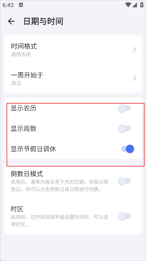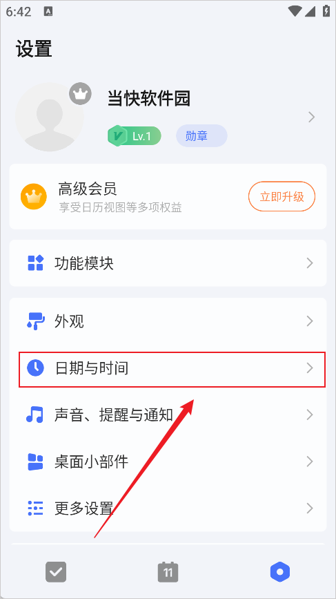 1、打开滴答清单,在设置页面找到【日期与时间】,点击打开。
