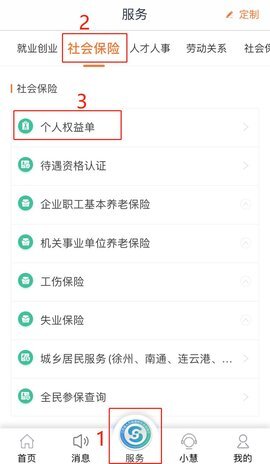 二、登录后,点击“服务”选项,接着选择“社会保险”,再点击“个人权益单”。