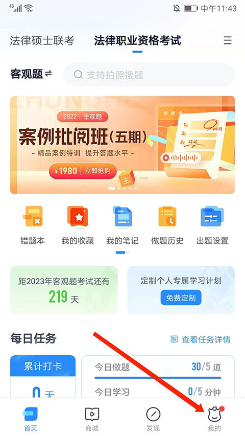 1、打开竹马法考法硕刷题宝典,选择右下角“我的”选项,