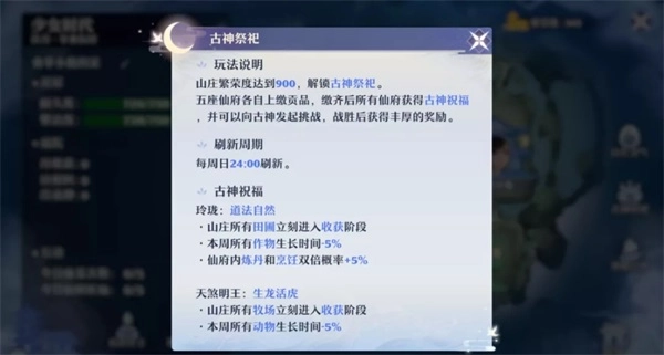 当山庄繁荣度达到900时,古神祭祀玩法将解锁。待山庄全体道友完成道具上缴后,便能开启古神挑战,挑战成功即可获取当周古神的祝福。