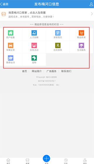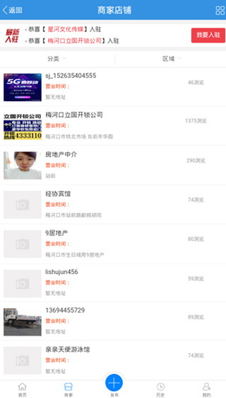在本站安装梅河口信息网后,能看到首页、商家、发布、历史、我的这五个板块。
