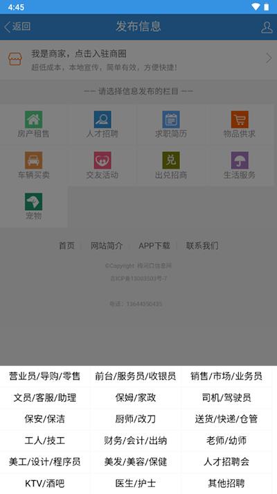 在首页,设有人才招聘、求职信息、房产租售、物品供应、车辆买卖、生活服务等各类服务板块。