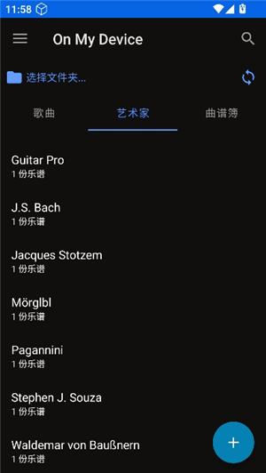 4、点击屏幕右下角的加号按钮,就能从电脑或手机的文件夹里导入乐谱文件