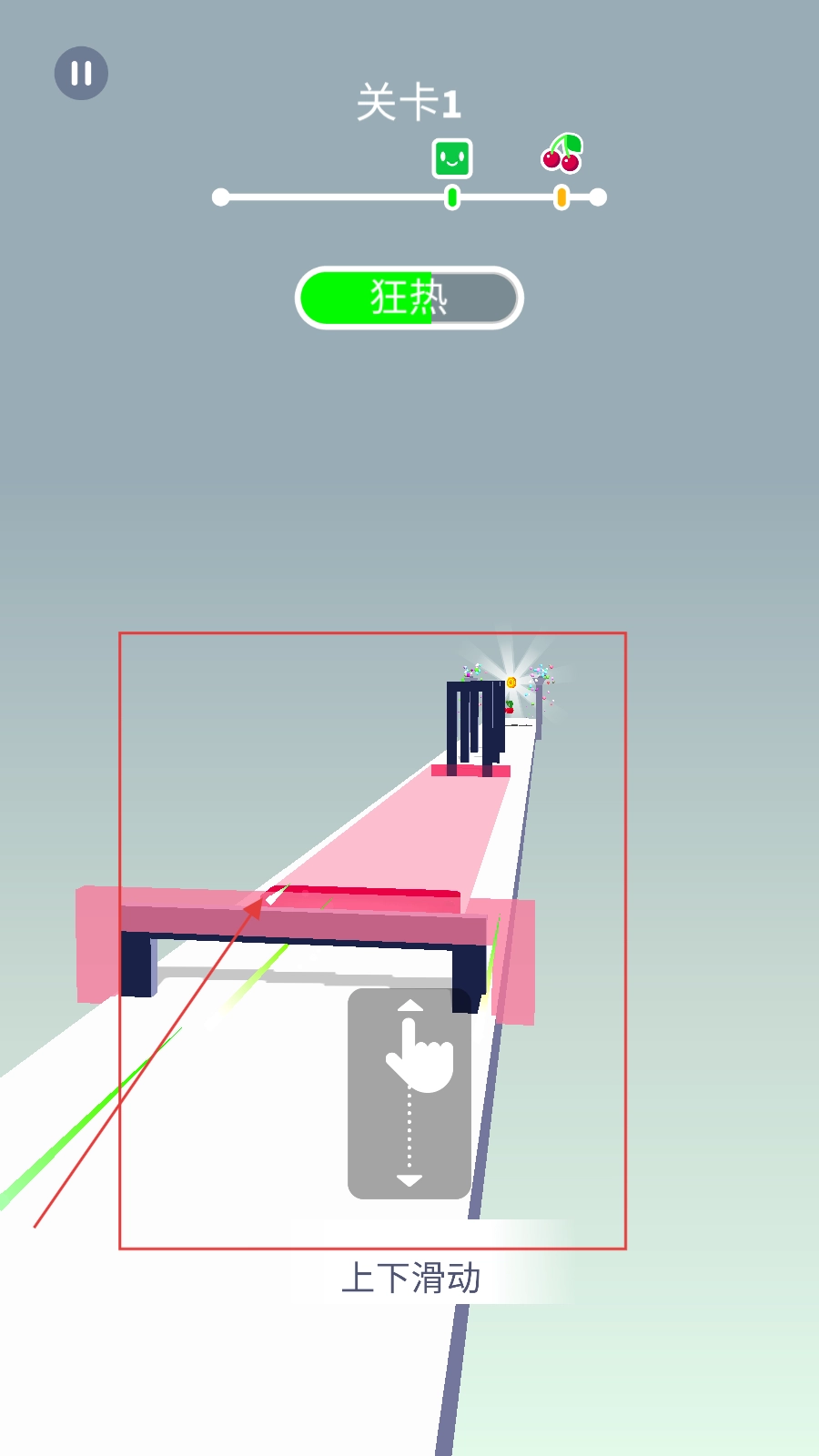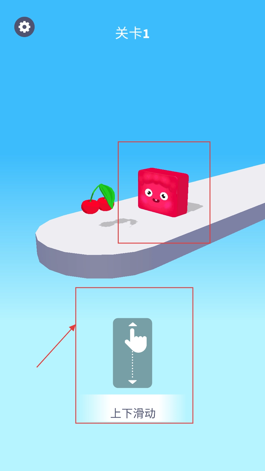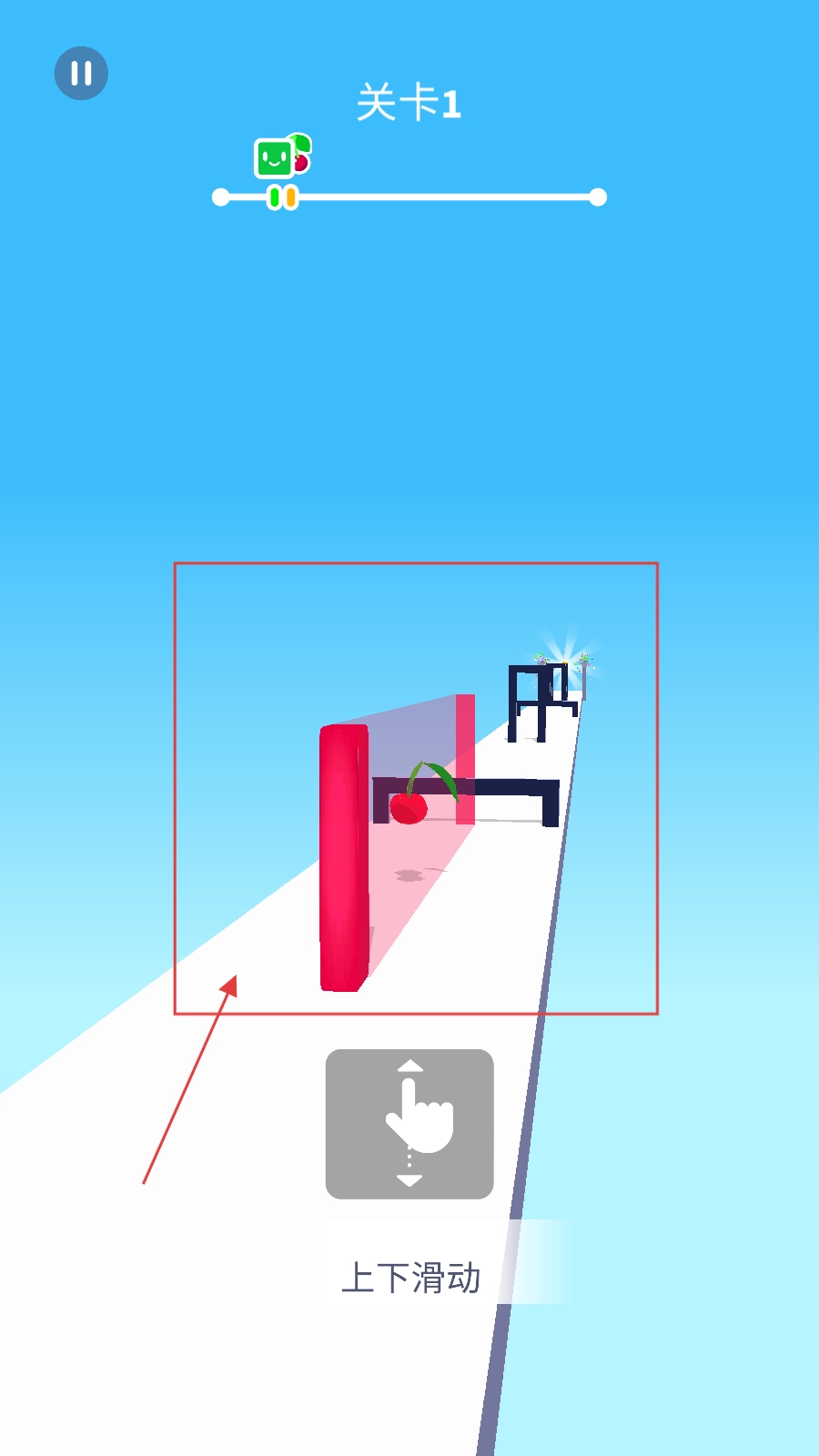 1、从【关卡1】开始,按照提示【上下滑动】按钮,来操控红色方块向前移动。