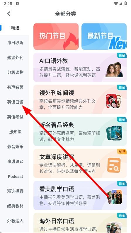 2、在全部分类页面,点击左侧列表中的英语口语。