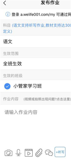 3.进入发布作业页面后,先选定对应的作业科目,接着录入作业内容(内容形式支持图片、语音、视频等多种类型)。