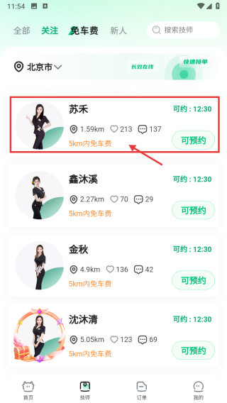 2、在技师页面,点击免车费分类标签,筛选免车费技师。