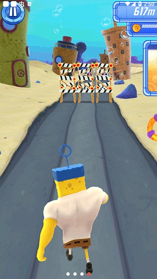 1、《海绵宝宝跑酷》正版中文免费安装版来啦!这是一款玩法超简单的游戏,下滑操作对应闪避,点击屏幕就能完成跳跃动作。