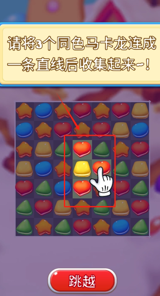 2、把三个同色马卡龙连成线,点击消除后记得按跳越继续下一关。