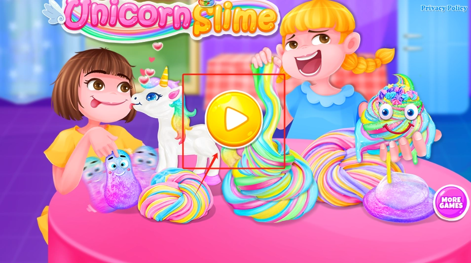 1、点中间的黄色播放按钮开始游戏,和两个女孩一起玩独角兽史莱姆。