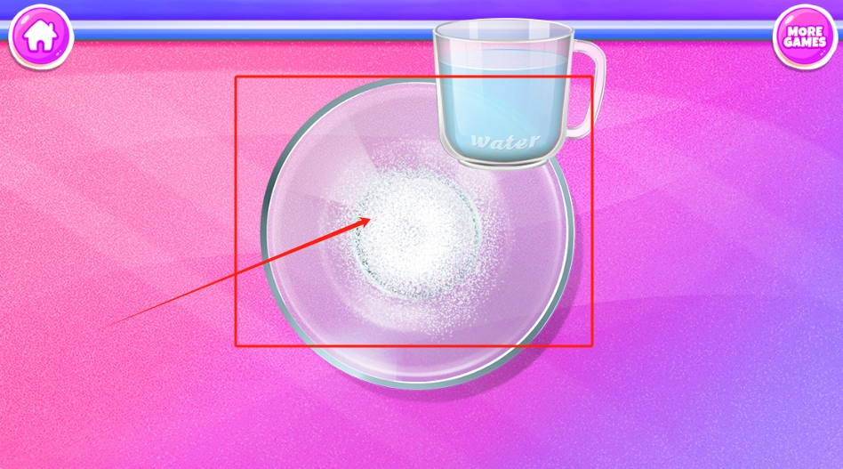 3、看红色箭头指示,把右边杯子里的水倒进左边碗中,混合白色粉末。