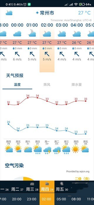 2、再次点击“常州市”,或者向上拖动,全屏展开的页面中显示有更详细的天气信息,如下图所示: