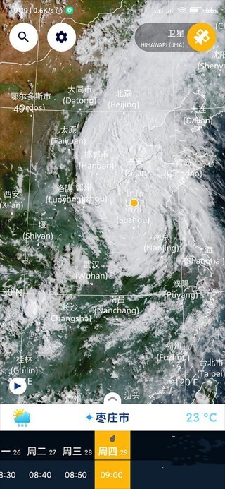 上图底部设有日期和时间两行,分别左右滑动这两行,就能查看历史数值与未来预报数值。调整日期或时间时,地图上的卫星云图也会相应变化。