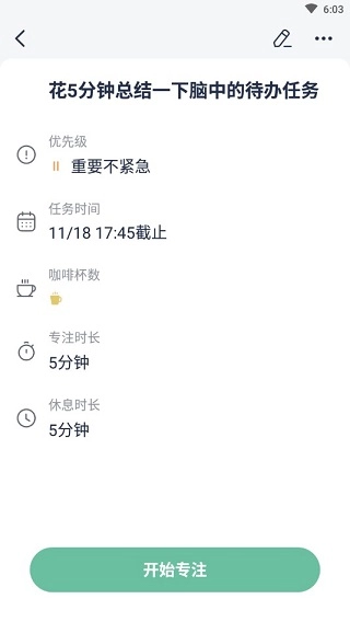 具体操作步骤如下:点击右上角的“…”或“铅笔”图标,即可对该待办任务进行编辑;编辑完成后点击保存,随后就能在待办清单中启动专注模式了。
