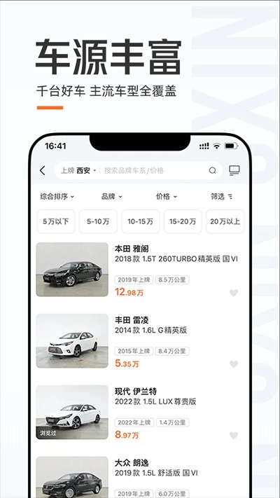 优信二手车是一款完全自营的二手车应用,平台为每辆车都提供了详尽的配置参数、油耗数据、所在地区、环保级别、变速箱类型、发动机信息、外观颜色以及上牌日期等内容,对于车辆存在的一些瑕疵也会提前如实告知,真正做到信息透明,让消费者能够安心购车。此外,平台还汇聚了大量品质优良的车辆可供挑选,车源十分丰富,各类主流车型一应俱全,同时支持试驾试乘服务,让用户可以充分感受车辆的性能表现,从而满足不同用户的多样化需求。